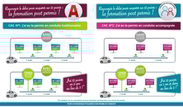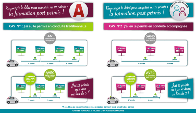 Les titulaires d’un premier permis de conduire qui choisissent de suivre une formation complémentaire « post permis », entre 6 et 12 mois après l'obtention du permis, bénéficient d’une réduction de la période probatoire.