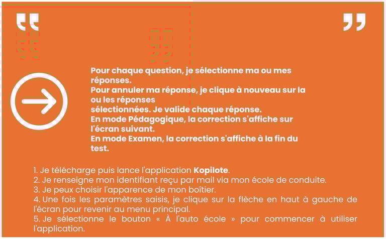 Pour réussir cette épreuve, il faut obtenir au moins 35 bonnes réponses sur 40 questions (5 erreurs maximum). Une réponse est considérée comme juste si toutes les propositions exactes ont été validées. Les questions seront affichées et lues, vous disposerez de 20 secondes pour y répondre. Parmi les 40 questions, certaines sont en vidéo. L'examen, d'une durée de 30 minutes, est composé de :