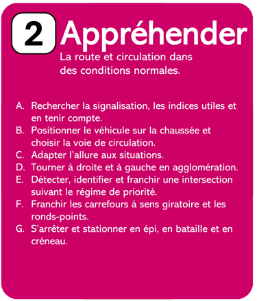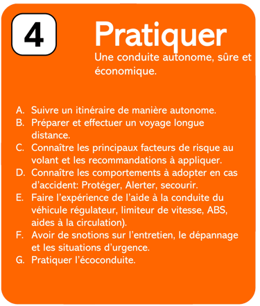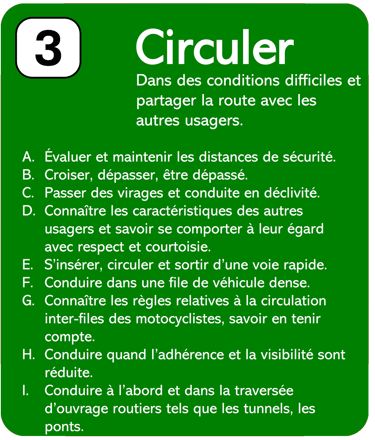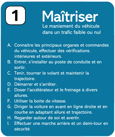 Il s'agit de la capacité du conducteur à avoir une maîtrise totale du véhicule et de son environnement, mais également à anticiper ses trajets. Le conducteur doit pouvoir circuler dans des situations simples ou complexes et de manière autonome.