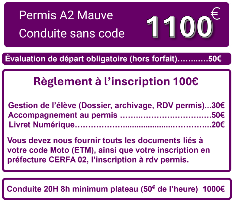 Le permis A2 permet de piloter une moto de plus de 125cm³ dès 18 ans, mais avec certaines restrictions de puissance. Après 2 ans de permis A2, il est possible de valider une formation de 7heures, passerelle, afin de lever ces restrictions et valider le permis A